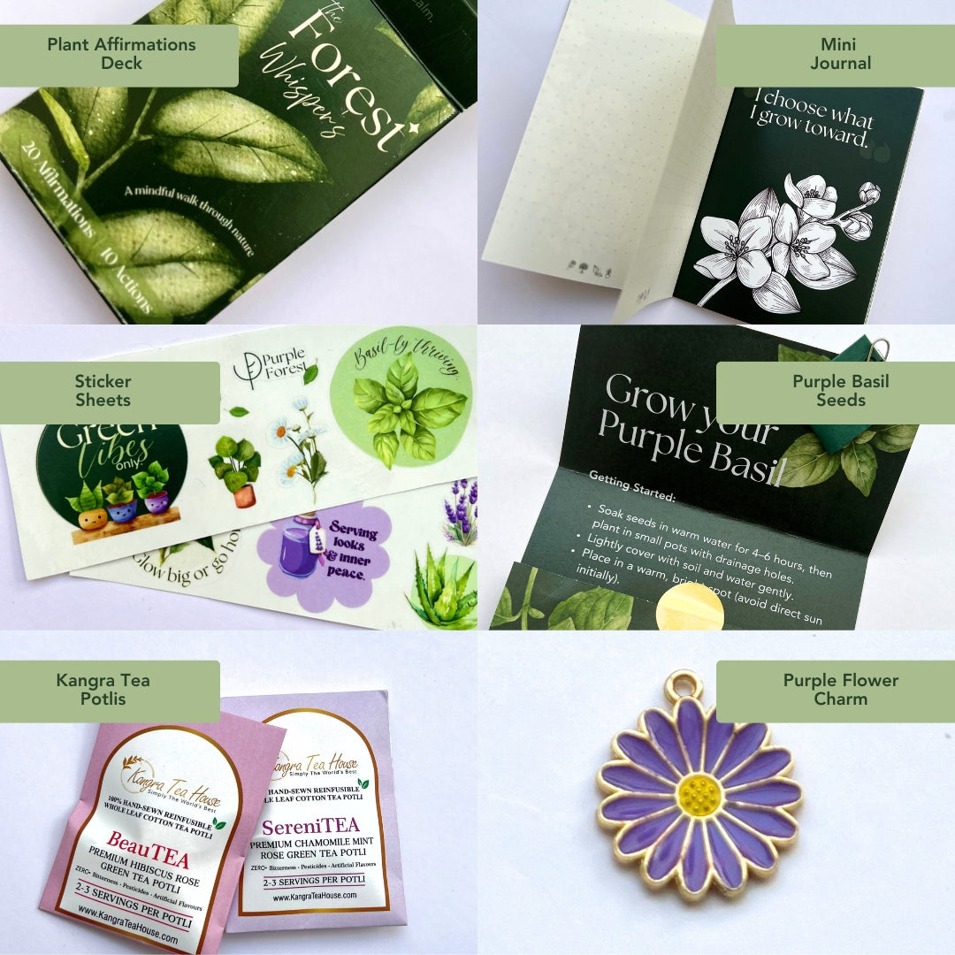 Every piece in this box is inspired by the calm and generosity of nature, and would make a great addition to your daily mindfulness routine. Spend sometime everyday with it - journal your thoughts, reflect on a plant card, or simply care for your basil plant!